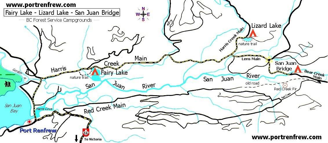 Direction: From Port Renfrew follow the Pacific Circle Route north for about 16.5 km until you reach a Y intersection. Stay right, leaving the pavement. At the next Y intersection stay right again onto Bear Creek Main. Follow until you cross the San Juan River on a long bridge (about 6 km of gravel). The San Juan Bridge Recreation Site is on the left immediately after the bridge.