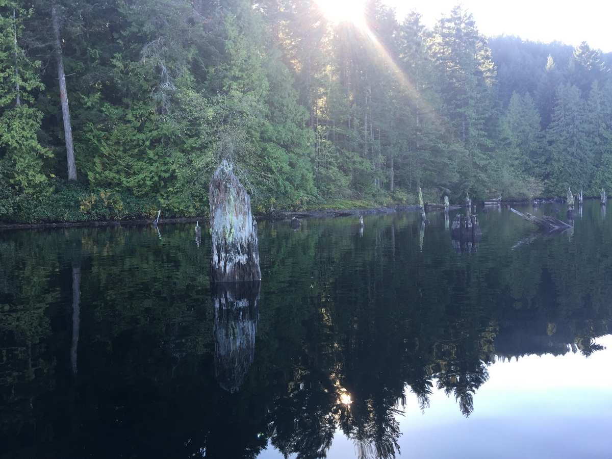 Although Westwood Lake is located well within Nanaimo’s City limits, on this autumn afternoon (Oct 27, 2017) it felt more like a tiny enchanted piece of wilderness. I found the Westwood Lake Park without difficulty and right at the entrance is a sandy boat launch, perfect for canoes or kayaks. Being a man made lake Westwood Lake is filled with the remnants of the forest that once stood there. One has to be careful to avoid old stumps, just below the surface, but the old wood gives the lake a gentle almost mystical feel. I set out lake in the afternoon and paddled clockwise around the shore line. On this, a Friday afternoon in autumn, I encountered a half dozen other paddlers enjoying this placid lake. It took me just under two hours to circle the lake at a leisurely pace, stopping to take pictures and admire this shallow gentle lake. Westwood Lake may be a busy place during the summer months but on this day it was a peaceful and enjoyable place to paddle.